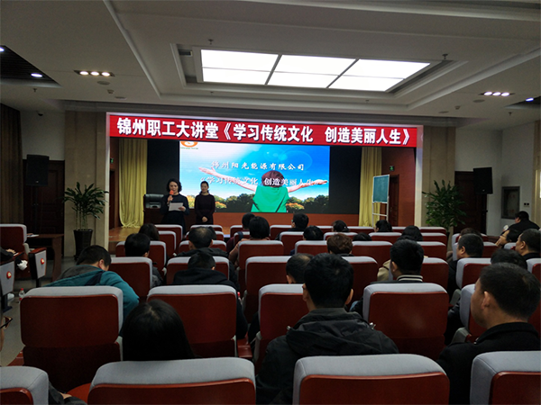 為弘揚(yáng)優(yōu)秀傳統(tǒng)文化,傳承國(guó)學(xué)先賢思想,提升干部職工思想道德境界,3月16日我司工會(huì)在錦州市職工會(huì)館四樓組織開展《學(xué)習(xí)傳統(tǒng)文化、創(chuàng)造美麗人生》培訓(xùn)講座,集團(tuán)職能部門管理人員及各專業(yè)公司主管及以上人員、光伏行業(yè)各企業(yè)職工共計(jì)160人參加。
