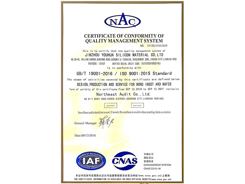 品質(zhì)管理體系認(rèn)証証明書(英語)