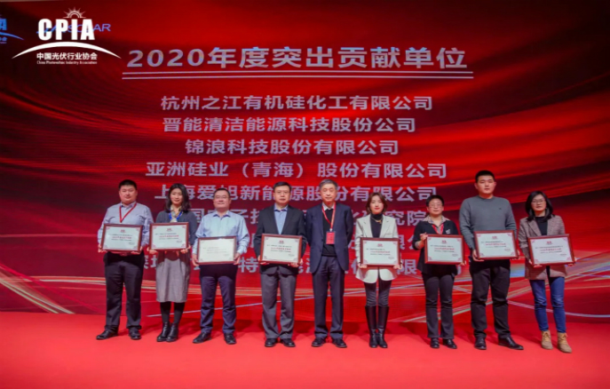 為感謝2020年度在協(xié)會(huì)各項(xiàng)會(huì)議活動(dòng)、標(biāo)準(zhǔn)及戶用工作等方面,做出突出貢獻(xiàn)的會(huì)員單位,在2020年中國(guó)光伏行業(yè)年度大會(huì)期間,特授予天合光能股份有限公司、晶澳太陽(yáng)能科技股份有限公司、晶科能源有限公司、陽(yáng)光電源股份有限公司、浙江正泰新能源開發(fā)有限公司、隆基綠能科技股份有限公司、華為技術(shù)有限公司、錦州陽(yáng)光能源有限公司、通威股份有限公司、杭州之江有機(jī)硅化工有限公司、晉能清潔能源科技股份公司、錦浪科技股份有限公司、亞洲硅業(yè)(青海)股份有限公司、上海愛旭新能源股份有限公司、蘇州賽伍應(yīng)用技術(shù)股份有限公司、深圳古瑞瓦特新能源股份有限公司、中國(guó)電子技術(shù)標(biāo)準(zhǔn)化研究院17家單位“2020年度突出貢獻(xiàn)獎(jiǎng)”。
