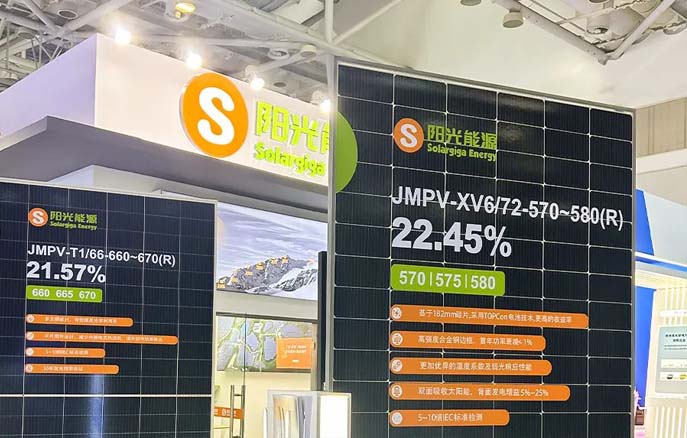 本屆展會(huì),陽光能源重點(diǎn)展示了Giga-N系列兩款高效產(chǎn)品,分別是182 72版型雙玻和182 54版型單玻全黑組件,采用前沿的N型TOPCon技術(shù),具備高效率、高發(fā)電量、高品質(zhì)等多重優(yōu)勢(shì),能夠?yàn)榭蛻魩砀叩膬r(jià)值。其中,182 54版型單玻全黑組件是陽光能源面向全球分布式市場打造的高端產(chǎn)品之一,外觀精美,量產(chǎn)效率可達(dá)21.76%,被廣泛應(yīng)用于建筑屋頂?shù)葢?yīng)用場景。