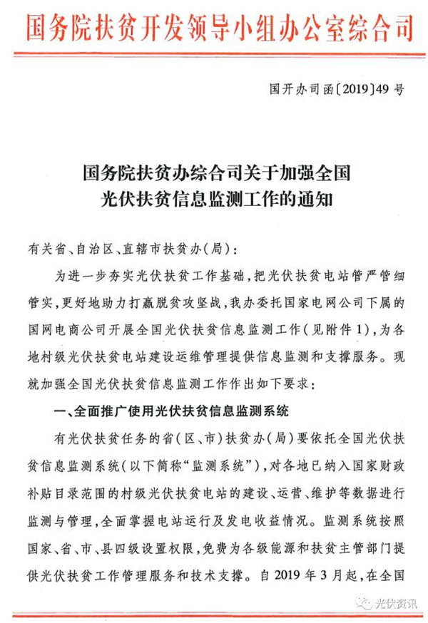 日前,國(guó)務(wù)院扶貧辦綜合司關(guān)于加強(qiáng)全國(guó)光伏扶貧信息監(jiān)測(cè)工作的通知,原文如下: